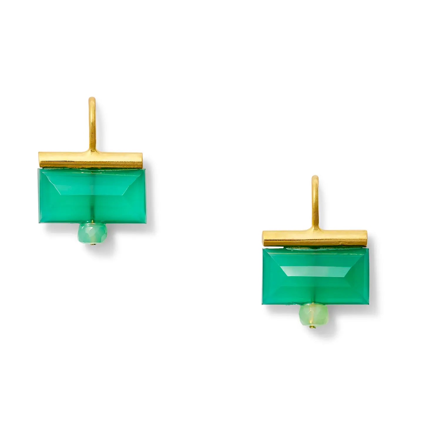 * Faceted rectangular chrysoprase bar * Chrysoprase bead drop * Polished 14-karat gold vermeil T-bar earring wire * Secure rubber earring backs * Approximately 3/4" wide x 1/2" drop