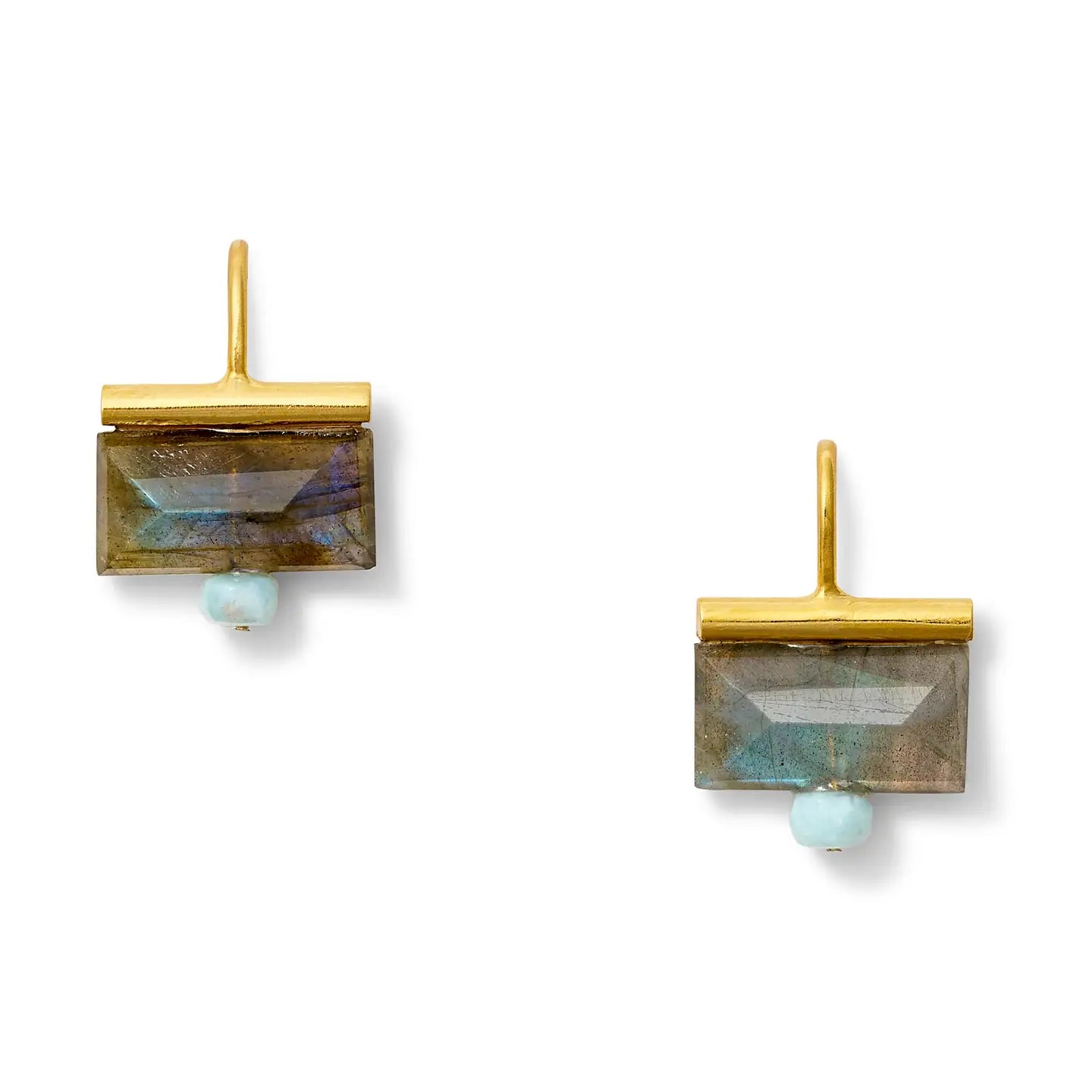 * Faceted rectangular labradorite with grey-blue flash * Tiny aquamarine drop * Polished 14-karat gold vermeil T-bar earring wire * Secure rubber earring backs * Approximately 3/4" wide x 1/2" drop