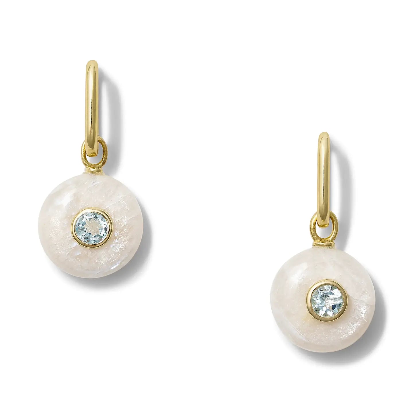 Vermeil (sterling silver with 14-karat gold overlay "Click" hoop huggy style Smooth, polished round moonstone in milky white with subtle shimmer Faceted blue topaz bezel-set center detail Elongated drop silhouette Overall length 1 1/4"