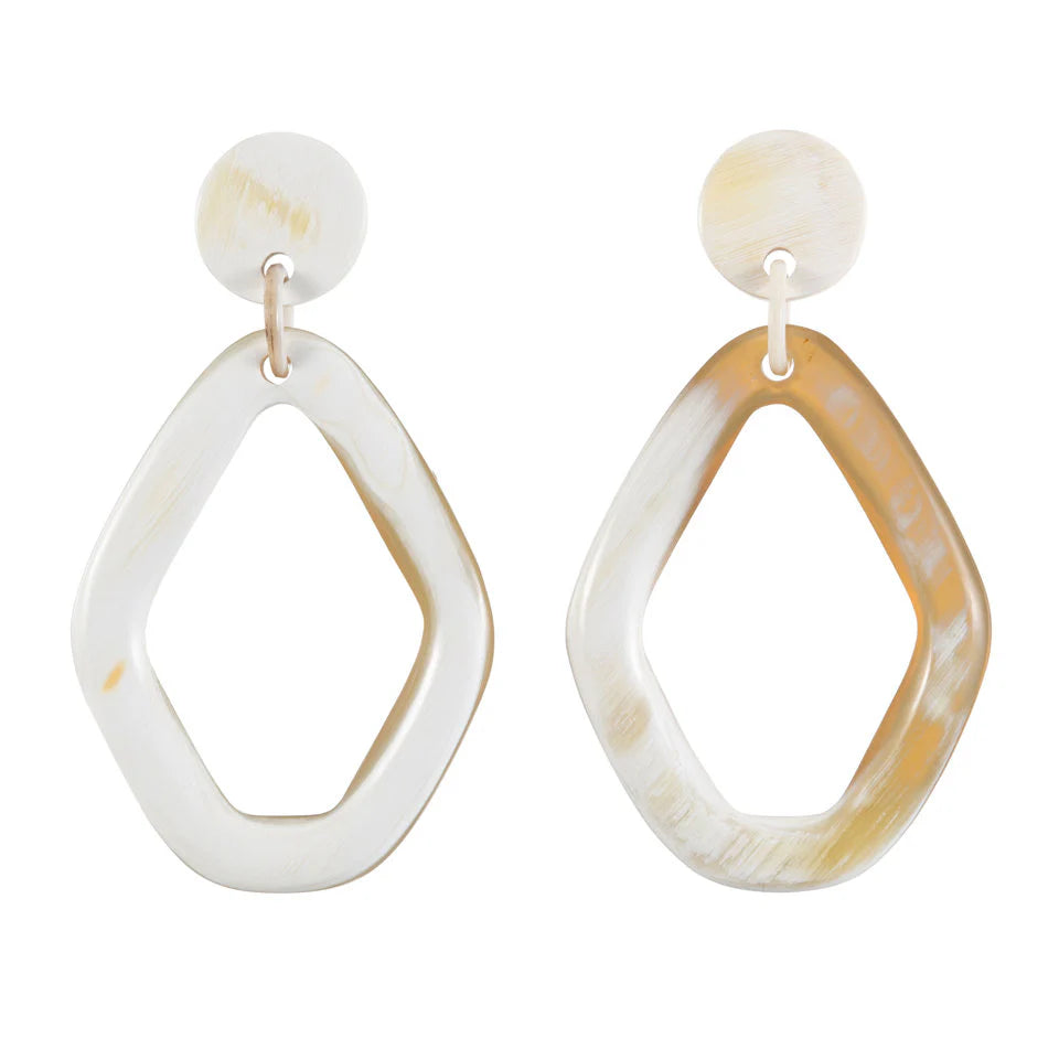 Natural buffalo horn open diamond shape dropped from a post. Buffalo horn is a natural material, each item has a unique character and may vary from image. 2" drop