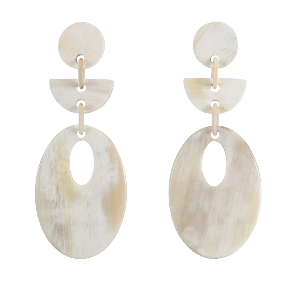 Natural light buffalo horn flat-linked shapes dropped from a post. Buffalo horn is a natural material, each item has a unique character and may vary from image. 2.5" drop