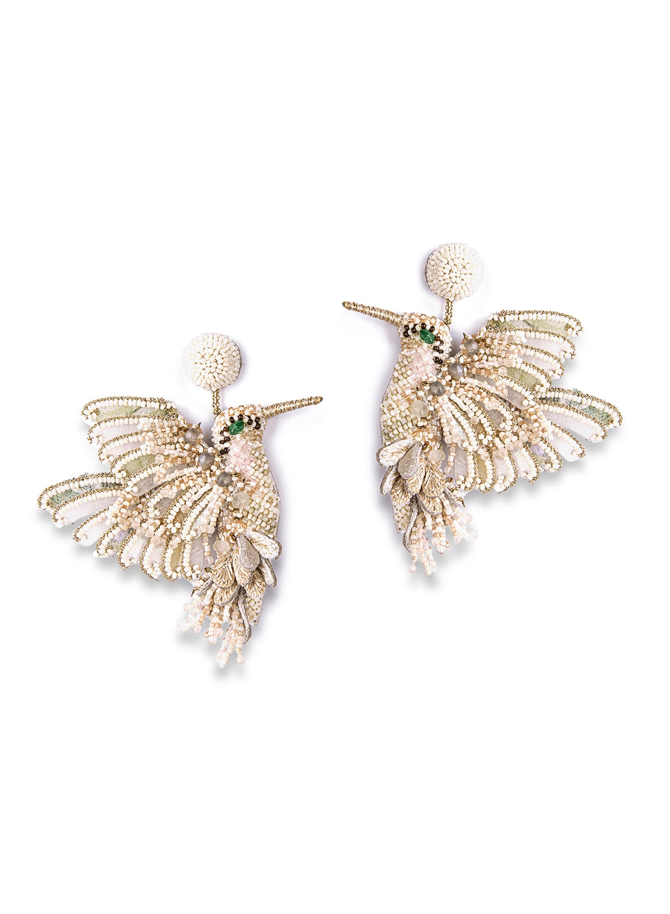 HUMMINGBIRD EARRINGS: 100% COTTON WOVEN WITH GLASS BEADS, BRASS COMPONENT, COTTON THREAD, NYLON THREAD, METALLIC THREAD, MILD STEEL POST. SIZE: 3.5"X3"