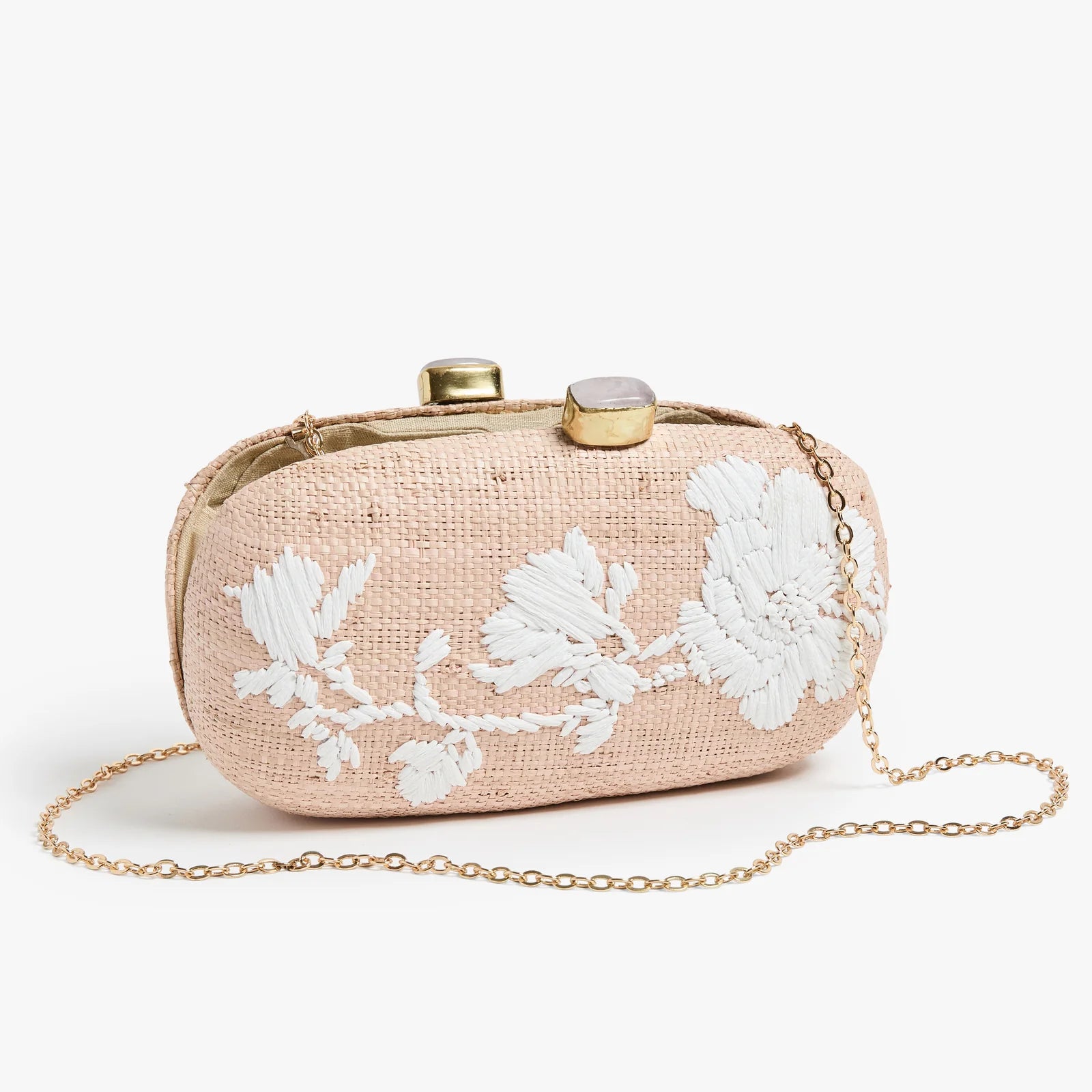 • Straw minaudière with hand-embroidered magnolia motif and semi-precious stone top closure