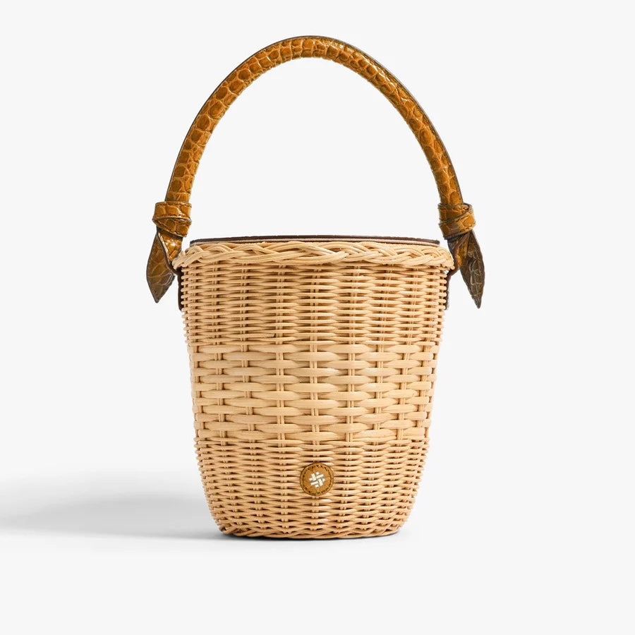 • Handwoven rattan basket bag with croc-embossed leather closure and top handle