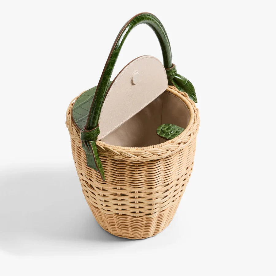 - Handwoven rattan basket bag with croc-embossed leather closure and top handle