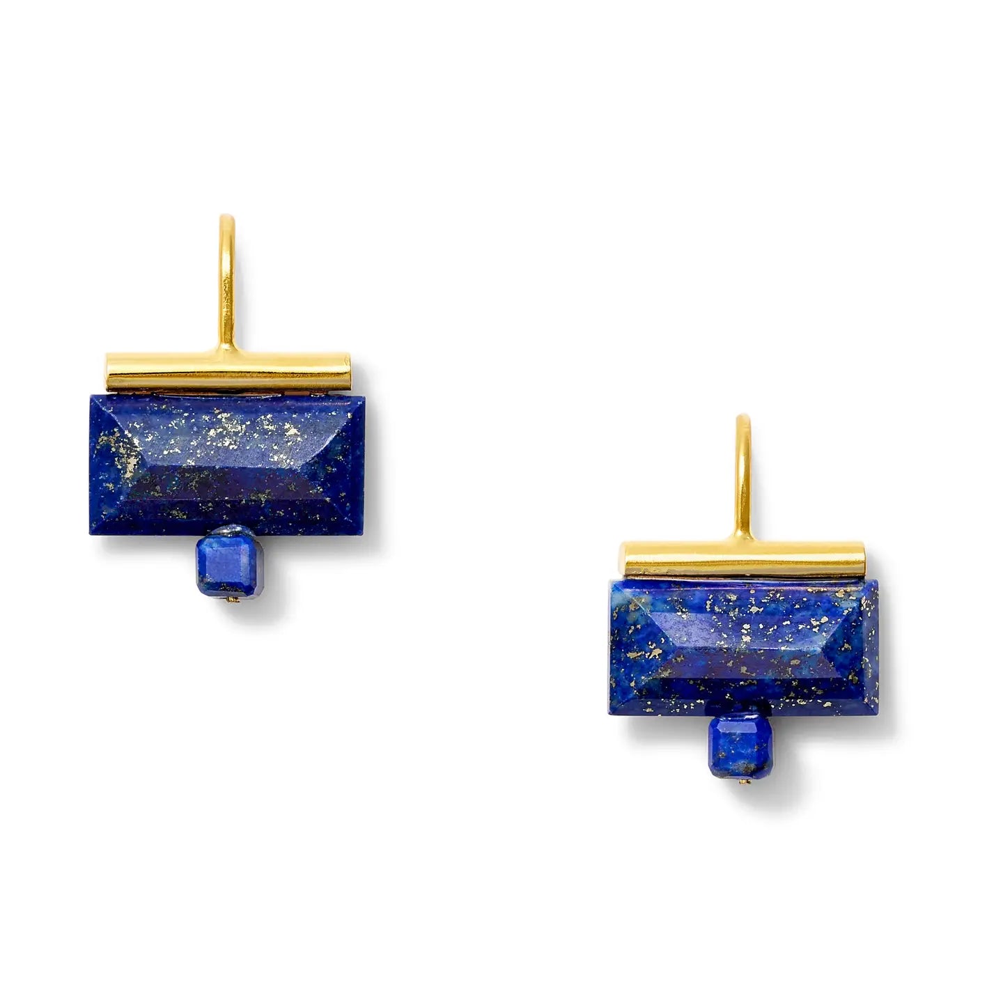 * Faceted rectangular lapis lazuli bar * Lapis lazuli cube drop * Polished 14-karat gold vermeil T-bar earring wire * Secure rubber earring backs * Approximately 3/4" wide x 1/2" drop
