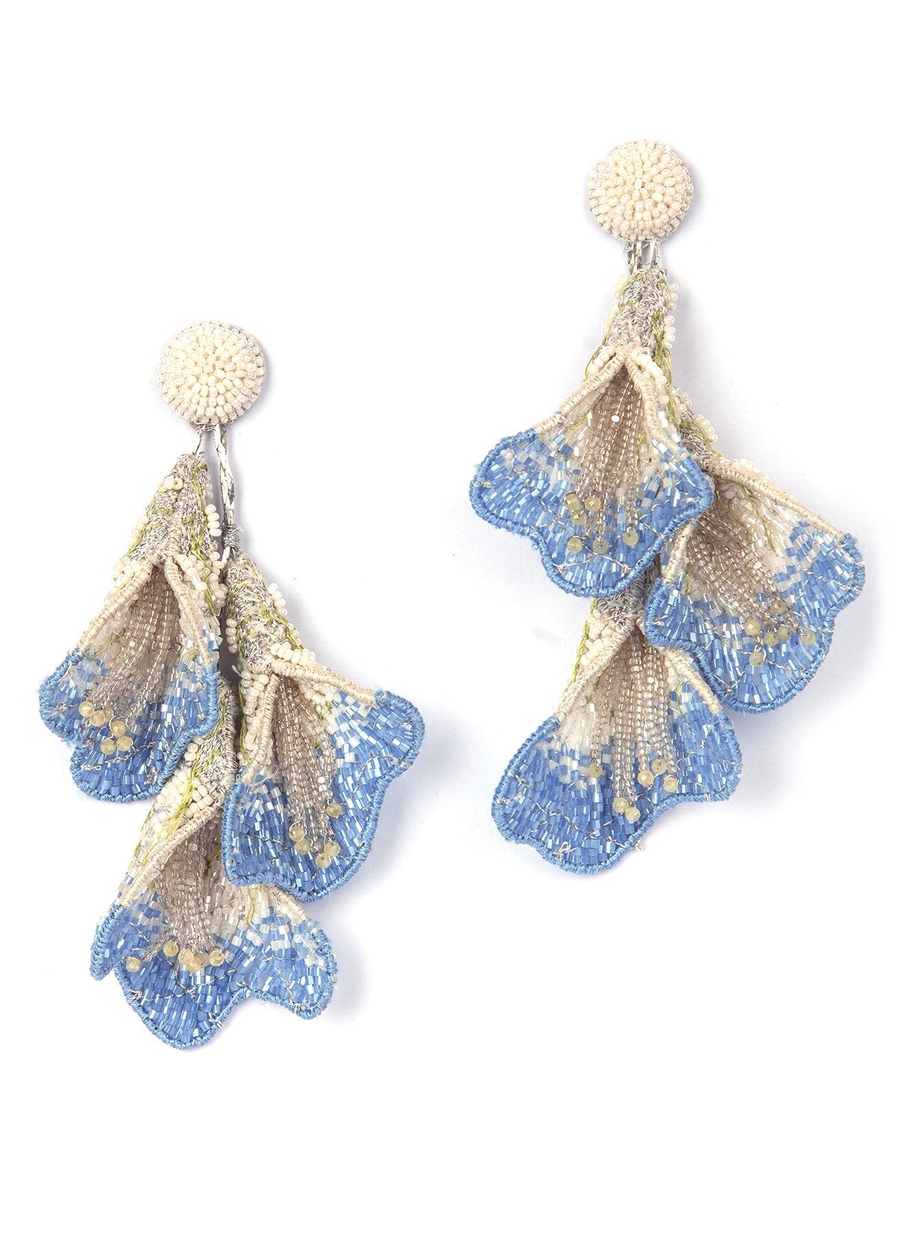 RHODA EARRING: 100% COTTON WOVEN WITH GLASS BEADS, BRASS COMPONENT, COTTON THREAD, MILD STEEL POST, LEATHER BACKING, NYLON THREAD, SILK THREAD, METALLIC THREAD.